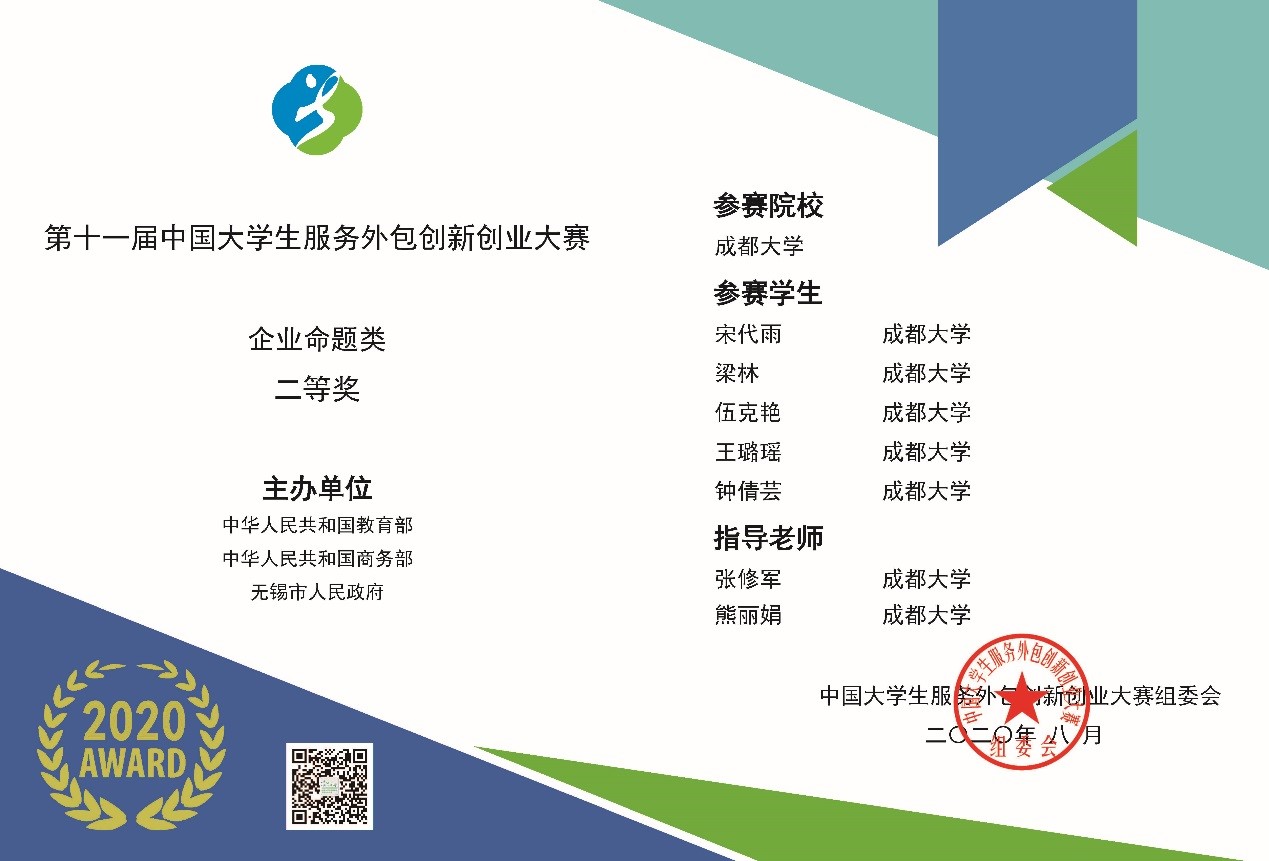学子宋代雨、梁林、伍克艳、王璐瑶、钟倩芸(张修军、熊丽娟老师指导)组成的队伍荣获企业命题组全国二等奖,做爱视频