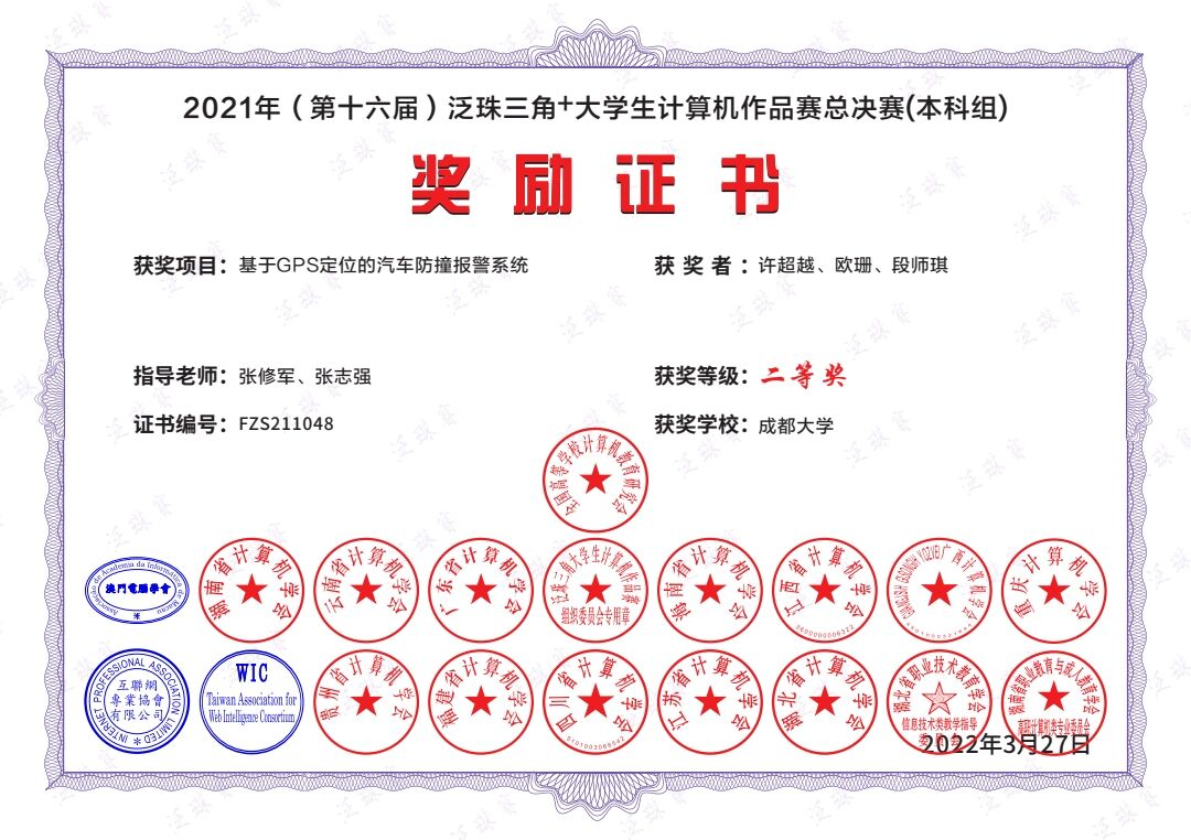 的张修军、张志强老师指导的学生团队参赛作品《基于GPS定位的汽车防撞报警系统》荣获本科组全国二等奖。