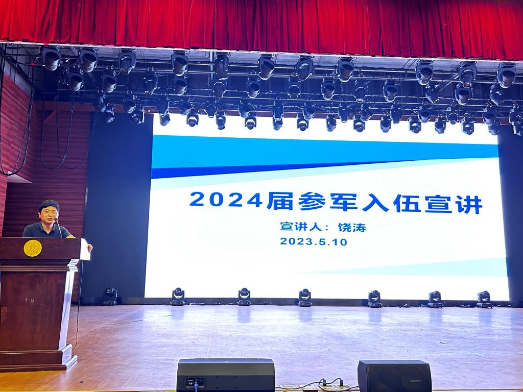 学工办饶涛作参军入伍宣讲,他详细介绍了入伍条件、报名须知、体检要求、经济补助等相关政策,并对退伍后的就业去向及安排等相关问题进行了讲解。