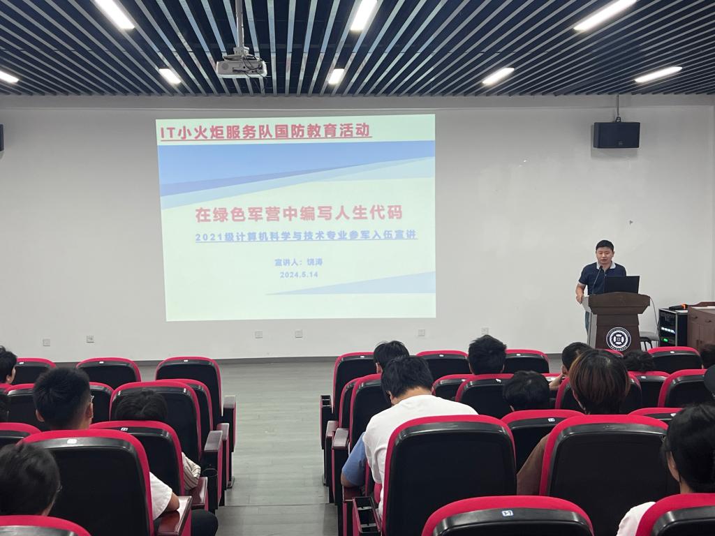 本网消息(图/龚硕 文/饶涛)2024年5月14日中午,IT小火炬国防教育活动走进2021级计算机科学与技术专业,学院学工办饶涛老师作“在绿色军营中编写人生代码”参军宣讲,学院学工办主任龚硕老师主持,2021级计算机科学与技术专业全体同学齐聚10501室。