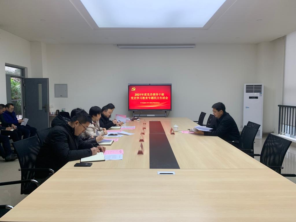 于1月13日下午在10106会议室召开了党史学习教育专题民主生活会,以“大力弘扬伟大建党精神,坚持和发展党的百年奋斗历史经验,坚定历史自信,践行时代使命,厚植为民情怀,勇于担当作为,团结带领人民群众走好新的赶考之路,推动新时代治蜀兴川再上新台阶、夺取全面建设社会主义现代化四川新胜利,为加快建设践行新发展理念的公园城市示范区而努力奋斗”为主题,按照有关通知明确的五个对照检查重点,进行深刻查摆剖析,严肃深入开展批评与自我批评。学校党委常委、副校长唐毅谦到会指导并点评,学院党委书记肖小琼主持会议,学院党政领导班子全员参会,学院师生党支部书记及系部科室主任列席会议。