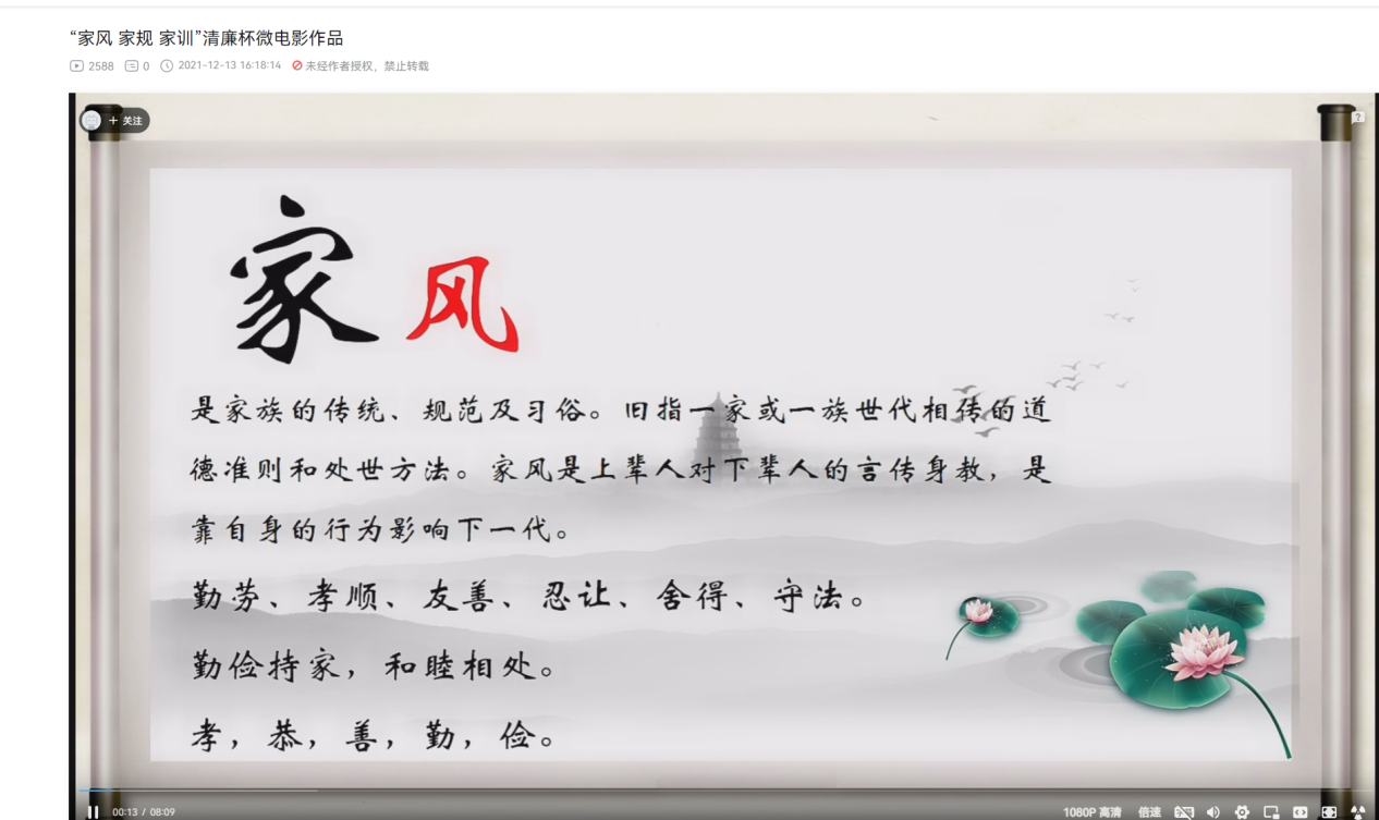 内涵:我的父母都是党员,从小接受父母的教育,红色血液在身体内流淌。父母告诉我说家风一定要严格遵守,家庭文明才能社会进步,千家万家都好,国家才能好,身为党员的我也要立志实现家庭文明新风尚。