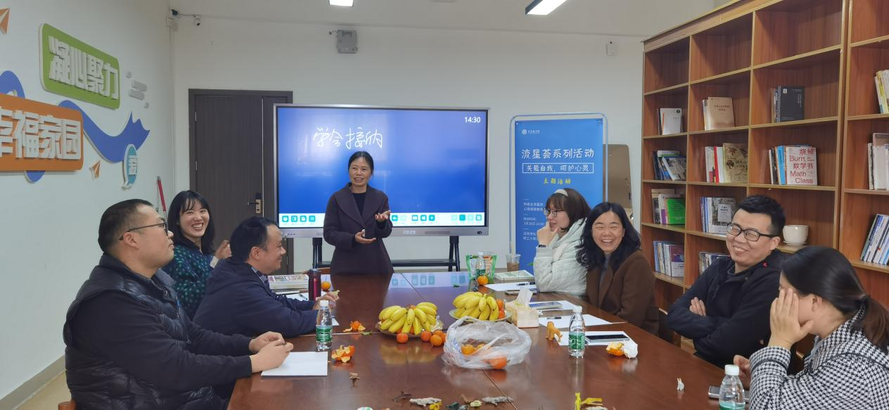 邵昌玉老师以“什么样的人是心理健康的人?”为题作为开场,以轻松愉悦的互动引导老师们分享了自己平时常用的心理调节方法,并通过寻找代表自己的小动物,结合完美主义问卷量表的填写,以及如果举办一场感恩会老师们会邀请谁来参加等环节让老师们梳理、表达了自己的心理健康状况。随后邵昌玉老师为大家引入了调节心理状况的几种积极方式:一是学会接纳,接纳生命中不可控制的部分、接纳自我、接纳自己的能力状况;二是不强求完美,强迫性追求完美会带来超负荷压力;三是寻求社会支持,有困难时,需要学会寻求帮助,有较多的社会支持的个人,内心才能有安全感;四是改变固有的负性思维,自我观察是改变的第一步,换一个视角看问题,切忌以偏概全并对自己和他人提出绝对化的要求。