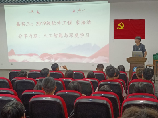 最后,2019级软件工程专业宋浩洁同学作“人工智能与深度学习”主题分享。宋浩洁同学向同学们介绍了当下人工智能巨头公司的状况和一些好玩有趣的应用,并当场进行了一系列的项目演示,引起同学们的好奇心,最后讲述了人工智能的未来趋势。