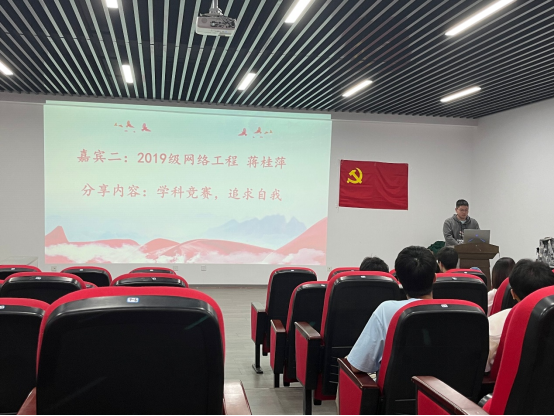 紧接着,2019级网络工程专业蒋桂萍同学作“学科竞赛、追求自我”主题分享。蒋桂萍同学分享了关于学科竞赛的经历,介绍了其在科创室当助理和加入工作室以来及其参加一系列竞赛中所获得的成功和收获,其优秀的经历让同学们倍感钦佩,并且强调同学们应该重视学科竞赛,多做项目。
