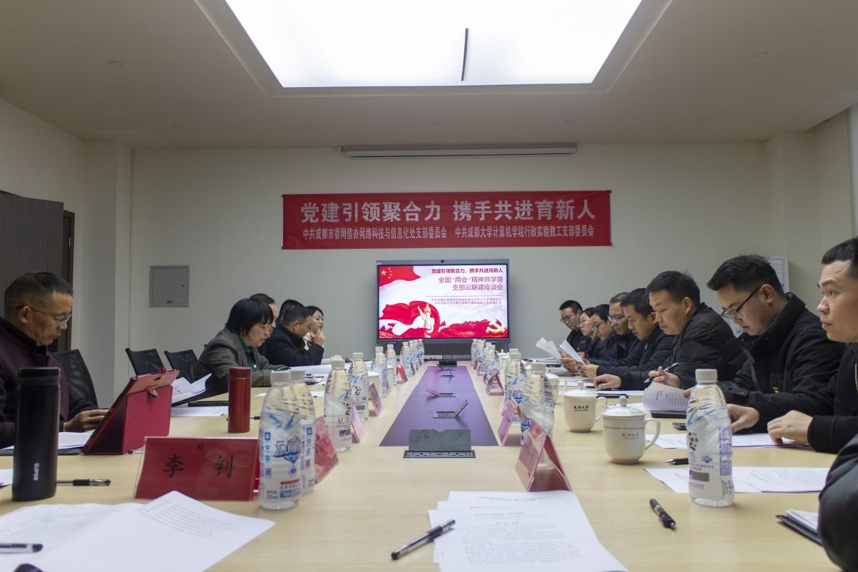 行政实验教工党支部全体党员参加座谈会。座谈会上,全体党员共同学习了全国“两会”精神以及《党史学习教育工作条例》。支部代表分别进行发言,分享各自党建工作的经验和想法,深入探讨党建与工作互融互促的渠道和形式。双方就成都市信息化相关领域的人才支撑、后备力量储备、人才培养、前沿领域科学研究、政校企合作、人才互派交流等方面进行了初步交流。最后,与会领导进行总结发言,对今后云联建活动提出了期盼和要求。