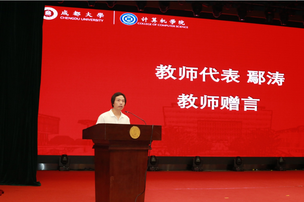 教师代表鄢涛深情寄语毕业生,希望大家敬畏规则,永葆终身学习的自觉,以空杯心态拥抱 AI 时代的挑战同时,也要在奋斗中守护健康与热爱。最后祝愿毕业生此去顺遂,母校永远是港湾。