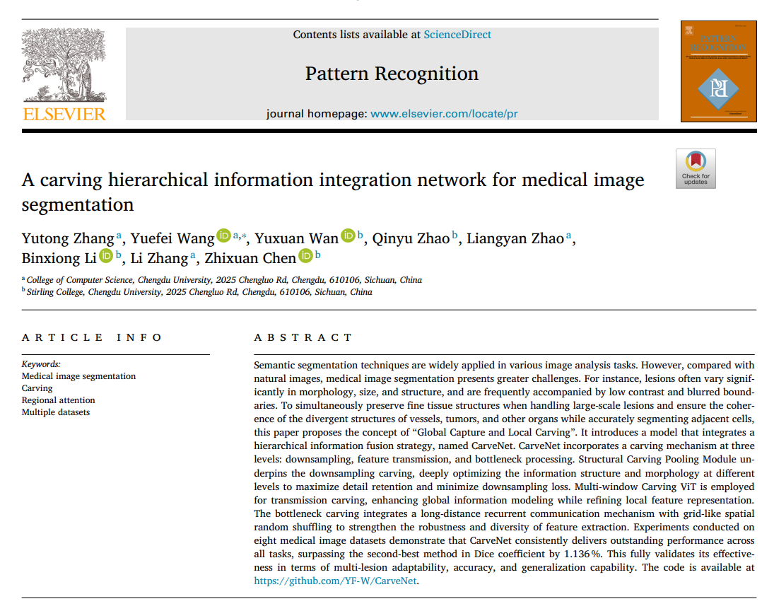 近日,学院王跃飞副教授团队在国际人工智能与模式识别领域权威期刊PatternRecognition(中国科学院一区,IF=7.6)发表题为“Acarvinghierarchicalinformationintegrationnetworkformedicalimagesegmentation”的学术论文,2022级本科生张羽彤为第一作者,王跃飞副教授为通讯作者,做爱视频