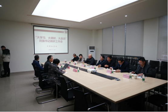 走访参观结束后,刘强及随行人员在10106会议室听取了学院院长高朝邦的汇报。汇报结合学院基本情况、深入分析与追赶院校的对标对表情况和差距,解读了学院“十四五规划”草案的战略目标、关键指标、“1334”发展思路等重点、特色工作。高朝邦结合学院目前各项重点工作开展情况,在汇报中列出“困难问题清单”,提出学院发展中遇到的困难和解决问题应对建议方案。