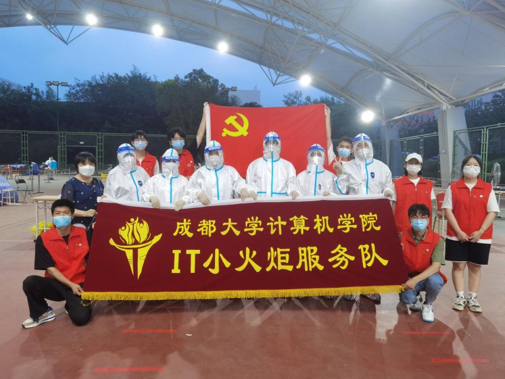 党委组织调派党员志愿服务队投入到学校风雨操场核酸检测工作中,7名教师党员志愿者和“IT小火炬”服务队7名学生志愿者由学院党委书记肖小琼带队,共计完成2187人次的核酸采样工作。