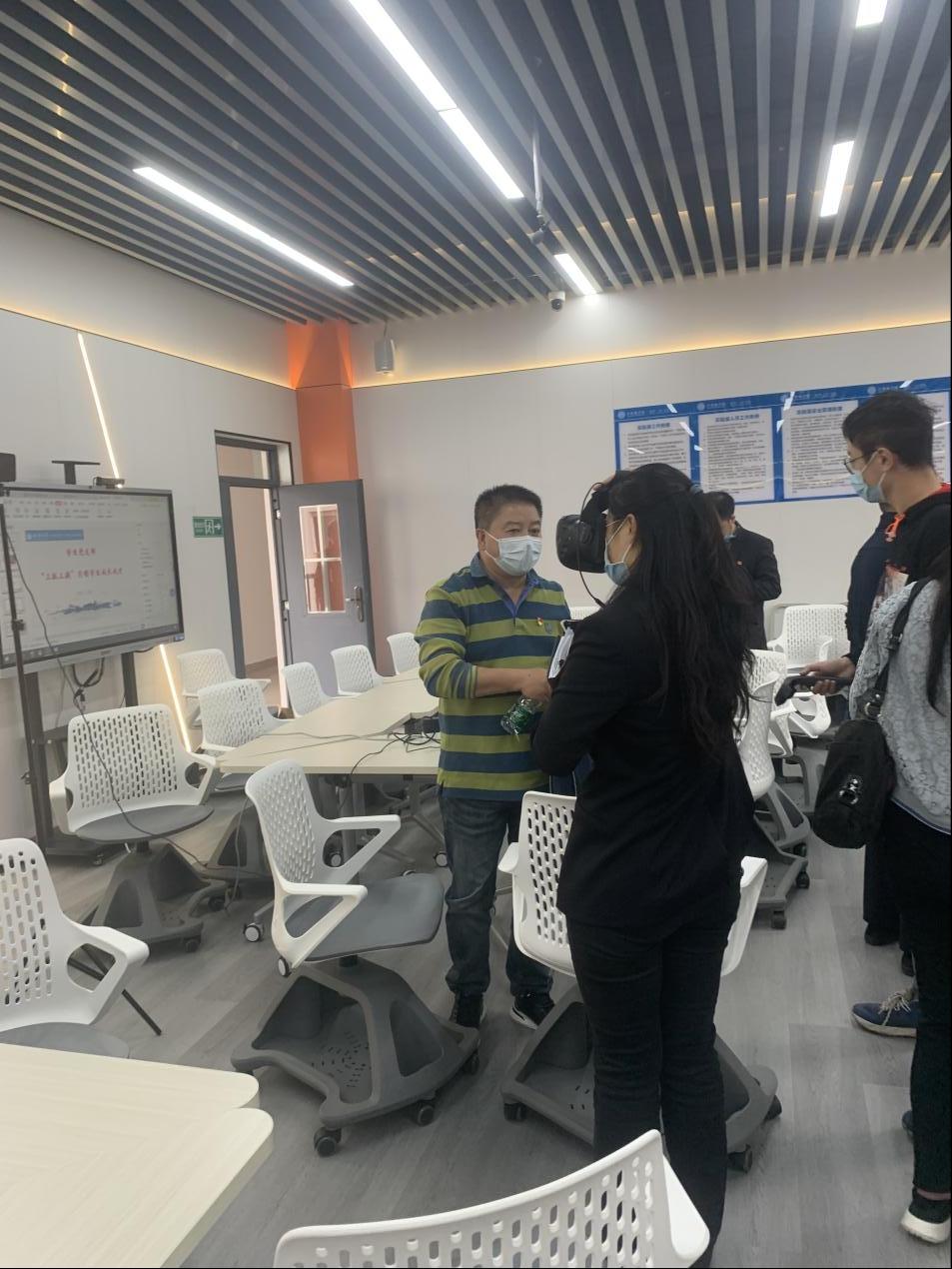 学院党委结合学院教学+党建思路,向与会老师开展VR虚拟现实技术进行三维建模与漫游互动的“VR参观百年党史”演示,获得了参观一行人员的关注及肯定。