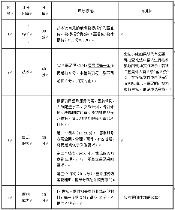 比选方法:按合格比选申请人的综合评分,从高到低排序,得分最高者为第一中标候选人。综合评分满分100分,其中报价30分,技术40分,售后服务20分,履约能力10分。