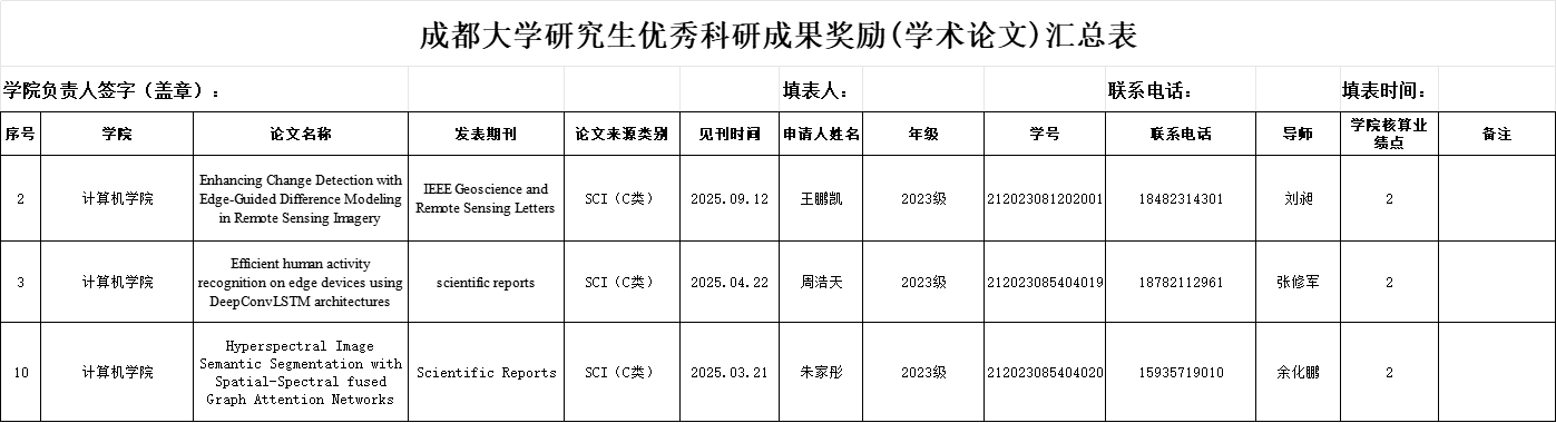 经个人申报、学院初审,现将2025年学院研究生优秀科研成果拟推荐名单予以公示。公示期:2025年10月29日-10月31日。师生如有异议,请于公示期内实名反映,逾期不予受理。联系电话:028-84616156。