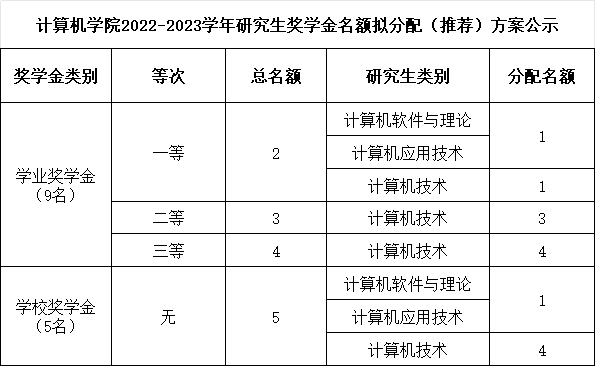 2022-2023学年研究生学业奖学金名额拟分配方案和学校奖学金名额拟分配方案公示如下,公示时间为2023年10月10日。全院师生如有异议,请于2023年10月10日17:30前向学生资助和评优评奖领导小组办公室反映。